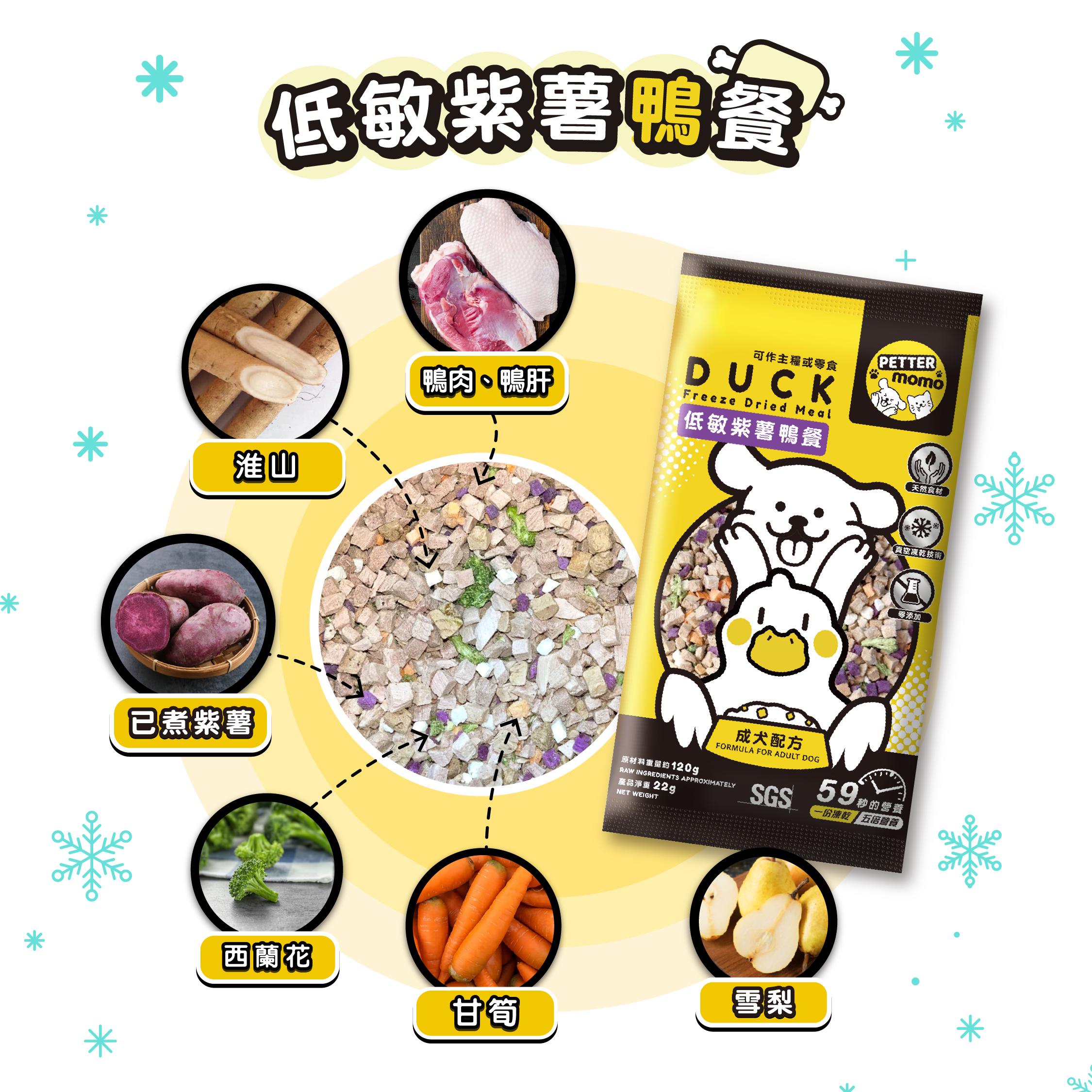 成分:鴨肉、鴨肝、已煮紫薯、西蘭花、紅蘿蔔、已煮淮山、雪梨、綜合維他命礦物質
