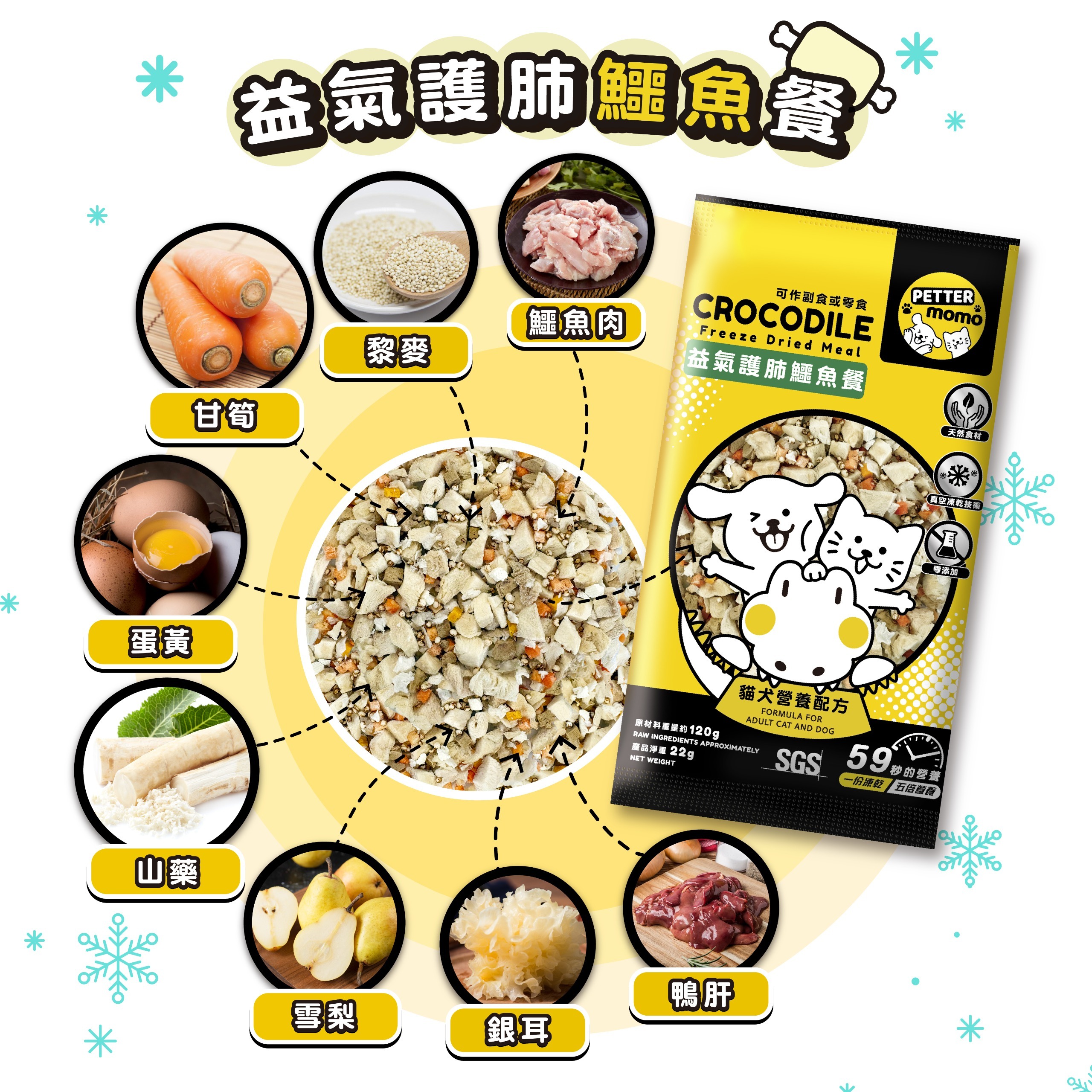 PETTERMOMO 的益氣護肺鱷魚餐特別配方,嚴選泰國高品質鱷魚肉,質地細嫩、適口性高,專為體質敏感及需要溫和調理嘅貓咪同狗狗而設。