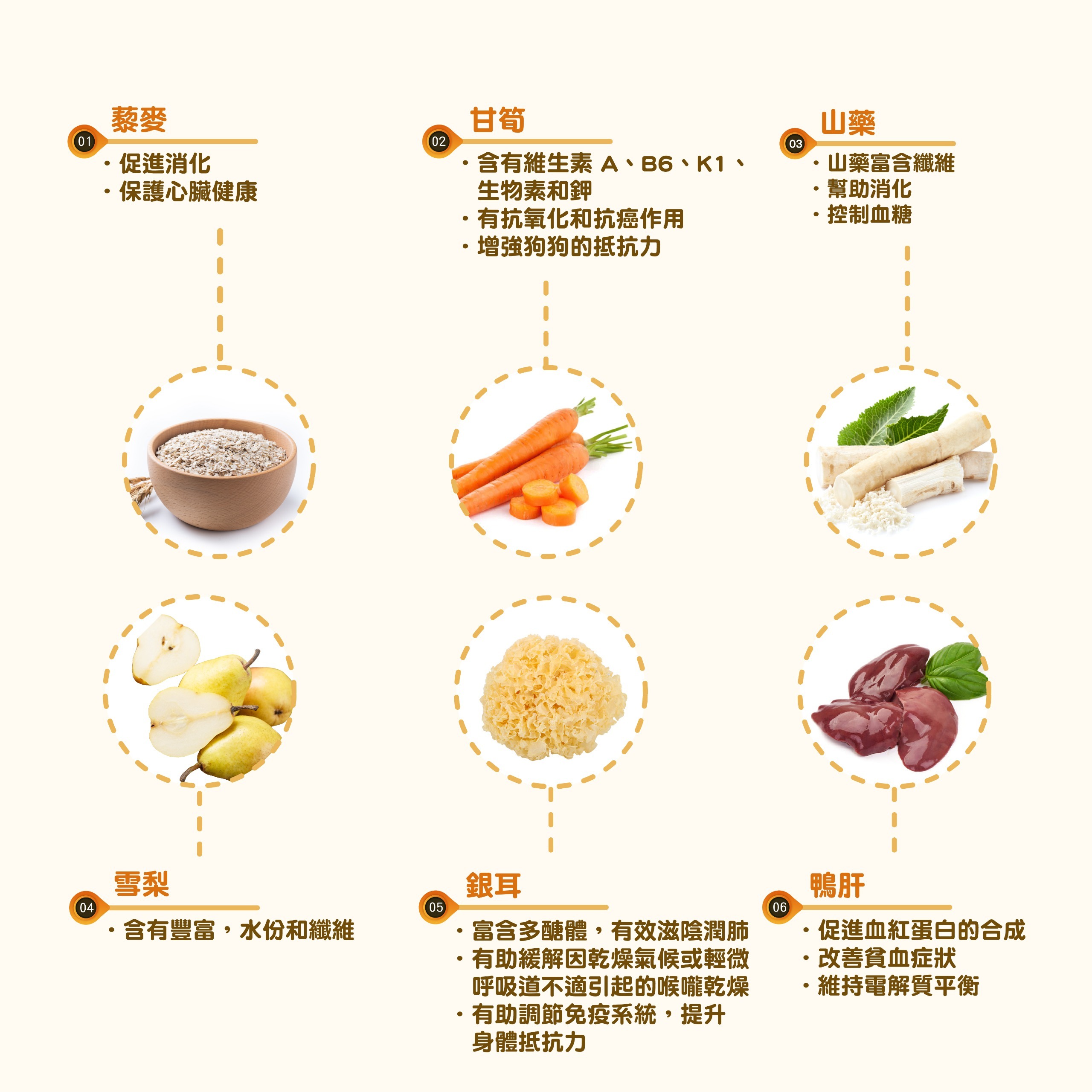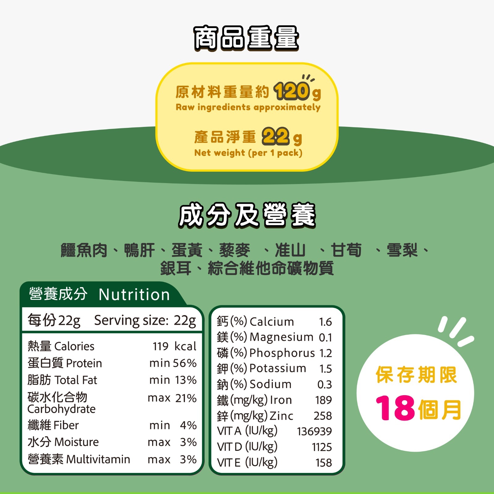 成分:泰國鱷魚肉、鴨肝、蛋黃、藜麥 、准山 、甘荀 、雪梨、銀耳、綜合維他命礦物質