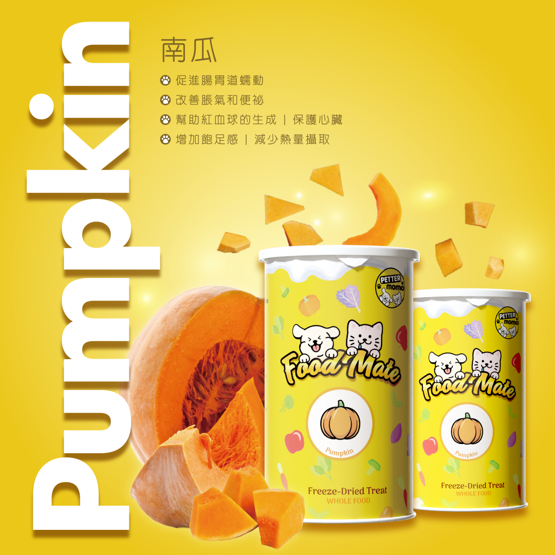 南瓜富含膳食纖維,能促進腸胃道蠕動,改善脹氣和便祕。而南瓜亦含有β-胡蘿蔔素、維他命A、C、E、葉酸和多種微量營養,有抗氧化作用,維持心藏、血液系統、眼晴和腸胃的健康,提升自然免疫力。南瓜亦含豐富的膳食纖維,不僅可增加飽足感,讓毛孩降低進食量,進而减少熱量攝取,達到控制體重的目的。