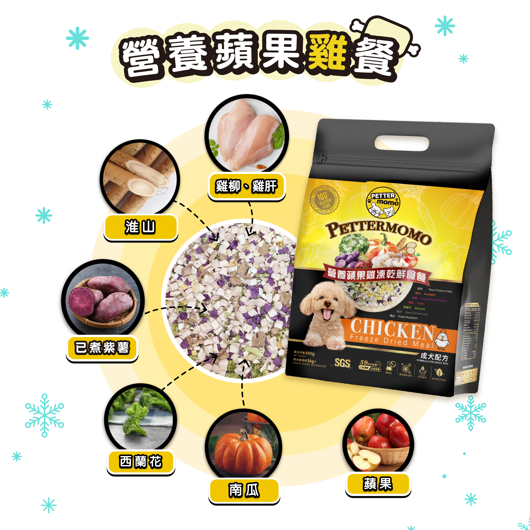 選⽤⾼品質新鮮泰國雞⾁,雞⾁含有豐富蛋⽩質,配合補充膳食纖維及維⽣素的蘋果和含β-胡蘿蔔素的南瓜等多種健康蔬果, 營養均衡,低卡路⾥又可增加肌⾁。PETTERMOMO是最符合營養比例的100%全凍乾餐!