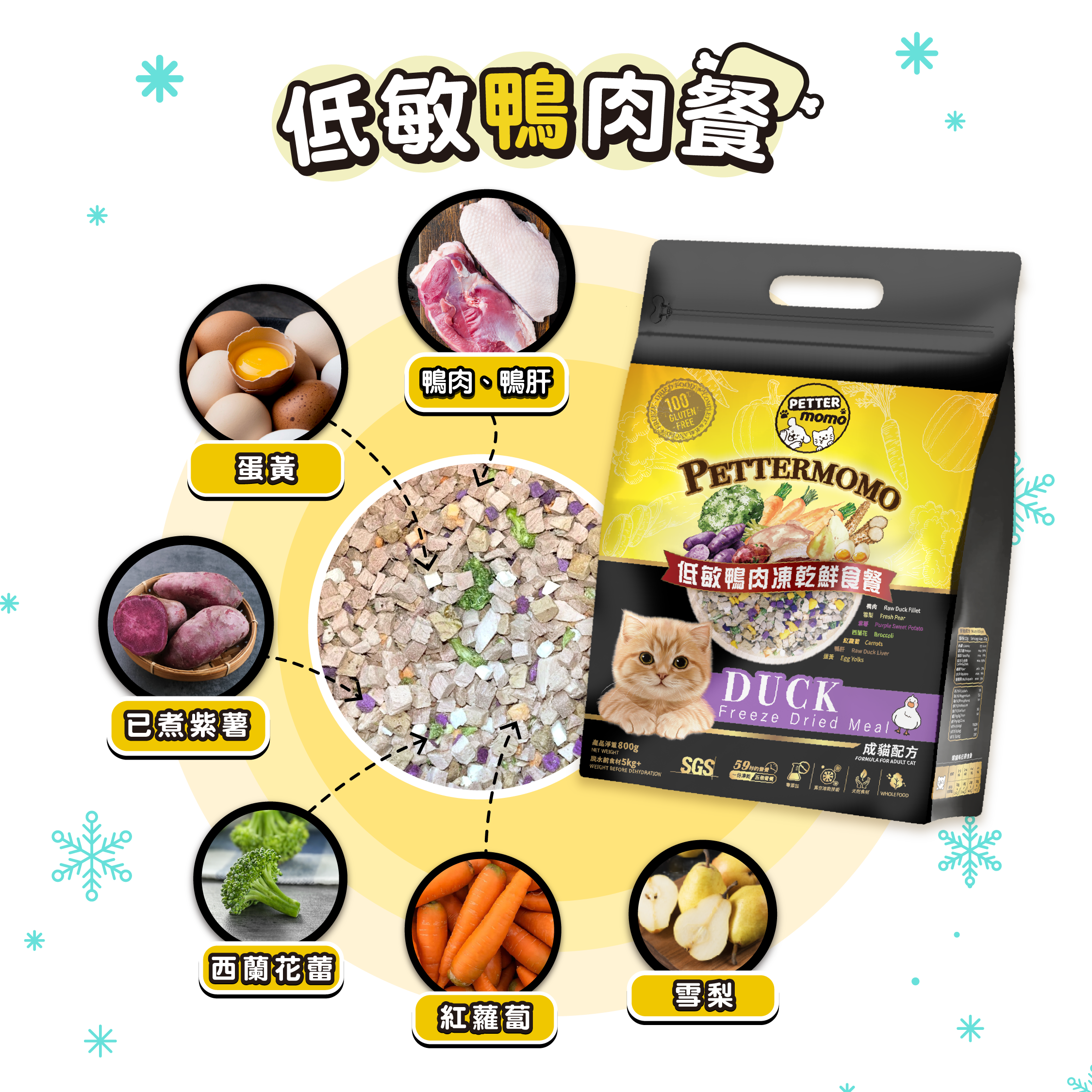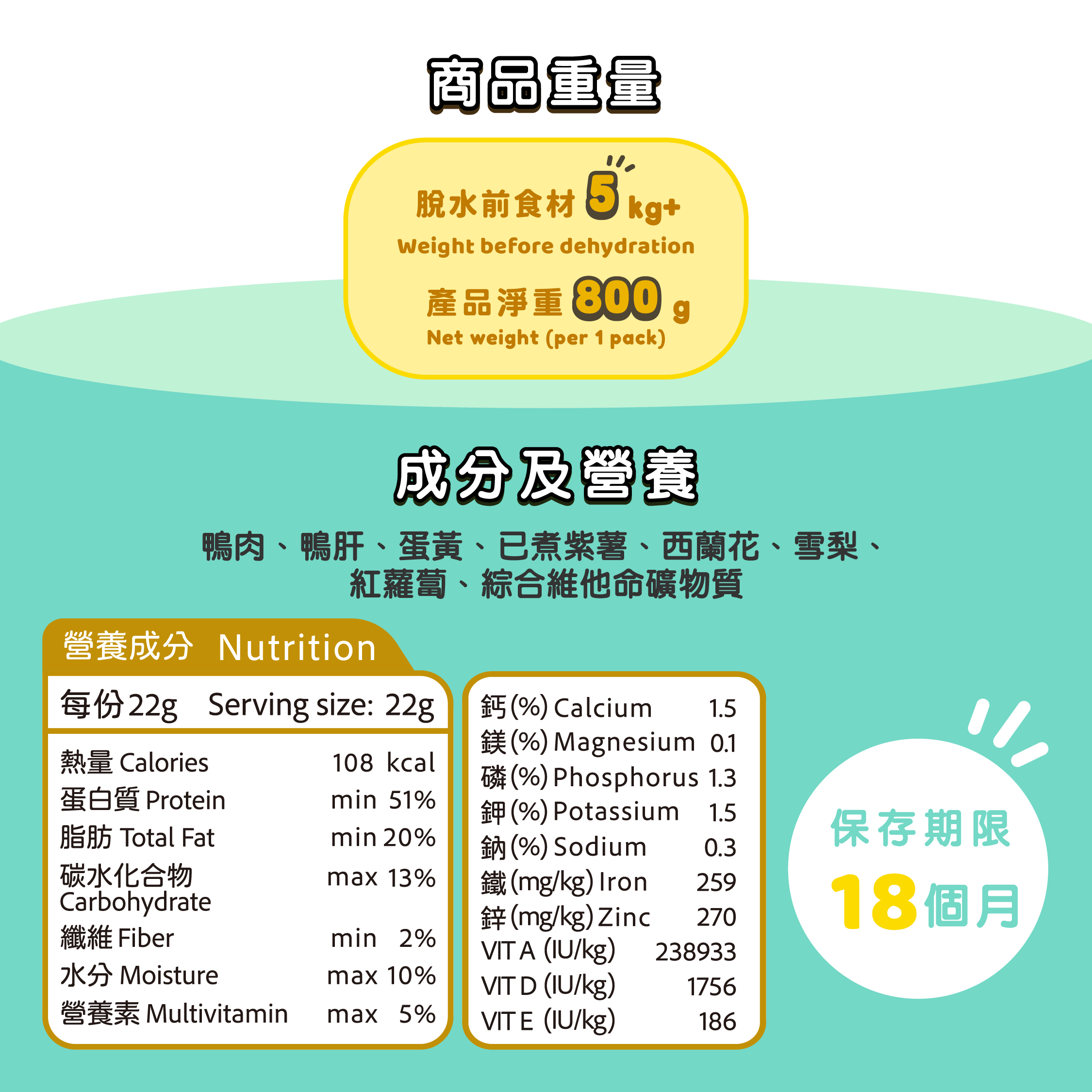 成分: 鴨肉、鴨肝、蛋黃、已煮紫薯、西蘭花、雪梨、紅蘿蔔、綜合維他命礦物質